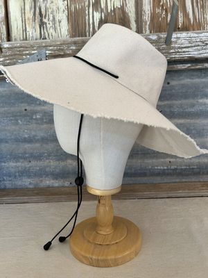 The sewing of the hat is unique to the very heavy canvas. Georgene had to get a leather machine, and study how best to sew it. The ‘made to fray’ edge of the brim is the result.